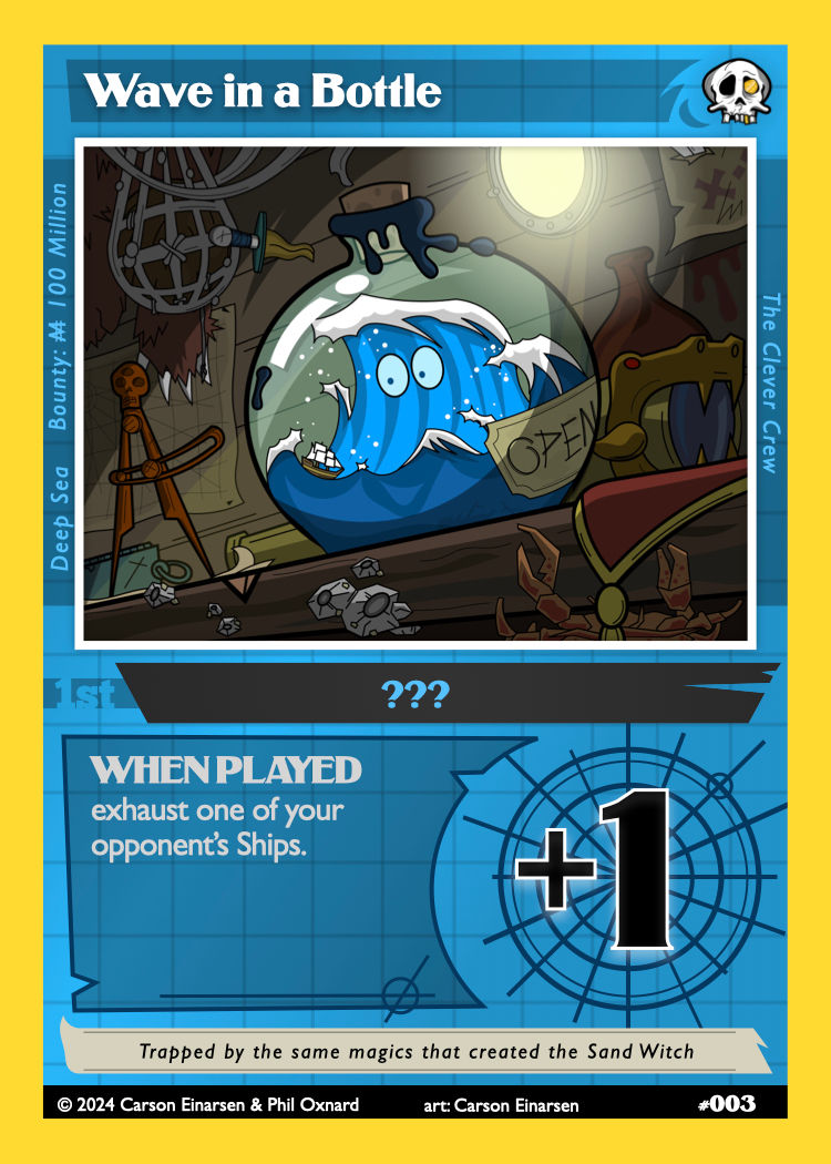 The card that exhausts an opponent’s ship? That's Wave in a Bottle. And only Wave in a Bottle. The card that returns one of your opponent’s Pirates to their hand? That would be Reef Ronin. And only Reef Ronin. In this way, each card has their unique slot that they occupy in your strategy. In other games there’s plenty of good design that goes into the use of keywords and abilities that are shared between cards. It becomes less of a question of ‘do I want this ability’ and more 'what flavor of this ability do I want'. That’s a cool decision for players to make. But since Here Be Monsters doesn’t have a mana system, that approach becomes a little trickier.
